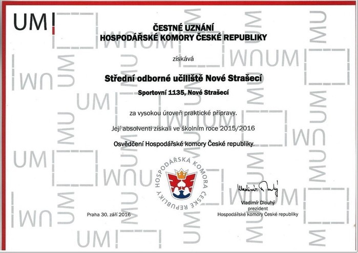Ze žáků SOU Nové Strašecí byli oceněni Kristýna Štíbrová a Lucie Valhová, absolventky oboru Zahradnice, Jan Pokorný, absolvent oboru Opravář zemědělských strojů, Jindřich Hanousek, Miloš Jelínek a Jiří Spousta, absolventi oboru Mechanik opravář motorových vozidel ve školním roce 2015/2016. Osvědčení se uděluje nejlepším absolventům středních odborných škol a učilišť, kteří splní přísná kritéria: